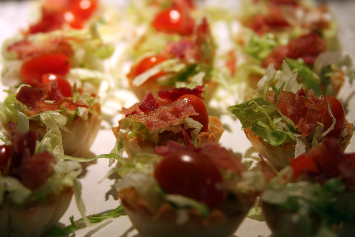 Take mini phylo shells (found in your grocery freezer) and thaw. Mix half a packet of Hidden Valley Ranch Dip mix with 8oz of non-fat sour cream. Place a “dollop” of the ranch dip in the bottom of the shells, top with shredded lettuce, a sliced cherry tomato and crumbled (cooked) bacon. A perfect litle Spring/Summer appetizer.