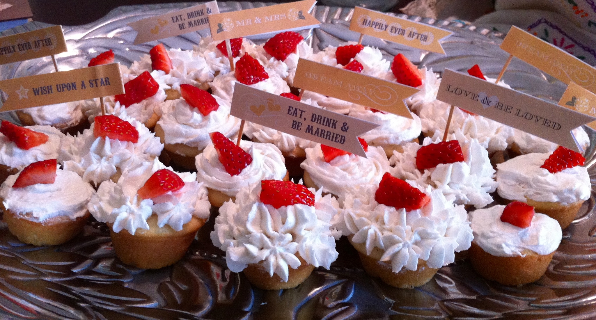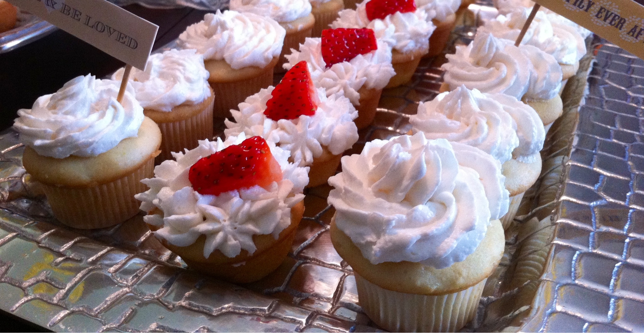 One of the best combinations, Champagne + Strawberries just got better…with cupcakes! I made these a while back for a wedding party for dear friends. The cupcake recipe was very simple, and I may have added a bit more champagne to the icing recipe! After baking and icing the cupcakes, I garnished each with a slice of fresh strawberry. Then, my creative brain dediced to  fill half of the cupcakes with strawberry jam for a flavorful punch. By punching holes into the center of each cupcake with a straw, I squeezed the jam into the center with an icing dispenser. Then, I decorated the tops with champagne icing.   I made over 100 cupcakes, and I was very pleased to take home empty platters.
