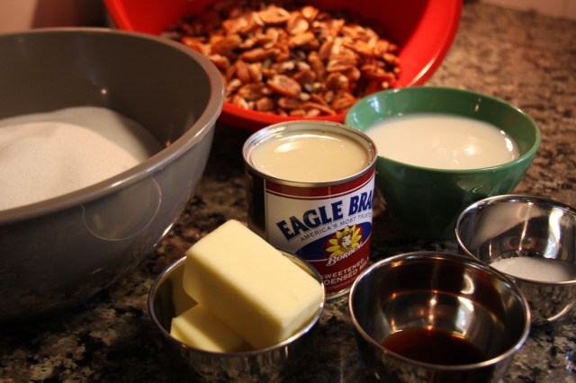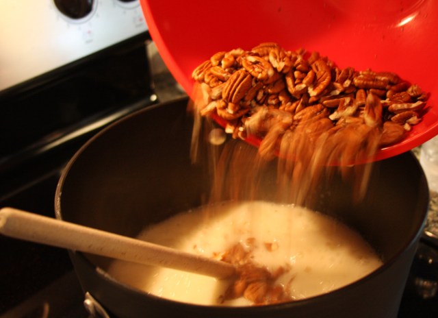 5 cups granulated sugar / 5 cups pecan halves / 1 cup butter / 1 cup milk / 1 – 14.5 oz can Eagle Brand Condensed Milk / 1 Tablespoon Salt / 1 Tablespoon Vanilla Extract / Wooden spoon