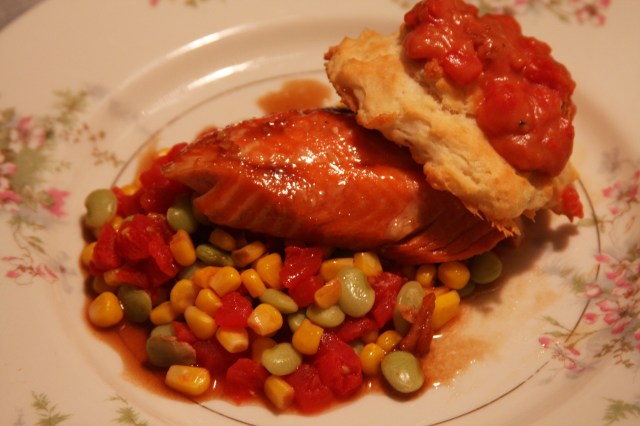 Unfortunately, I won’t be with my mom this Mother’s Day, but for those of you lucky enough to spend the day with your most-admired lady, here’s a savory meal that is tasty enough to impress, yet simple enough to stave off stress and enjoy time with Mom. Marinate salmon filets with a mix of bourbon and brown sugar, place in tin foil and grill until done. Serve over a simple succotash, with buttermilk biscuits and tomato gravy.