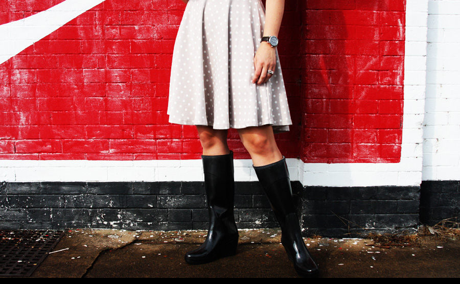 Umbrella: Ralph Lauren (similar style here); Necklace: Stella & Dot; Dress: H&M (recent); Belt: Talbots (similar style here); Watch Face: Timex Weekender; Watch Band: Unknown; Bag: Gucci; Wellies: Hunter