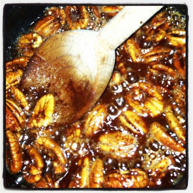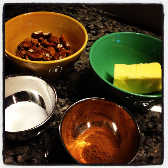 Pecans are a staple in any Southern woman’s kitchen, and each year, my dad picks, shells and packages pecans for me to freeze and use throughout the year. As I was looking for a sweet treat last night, J grabbed a bag of pecans from the freezer, and a few minutes later, we had the perfect fall snack.