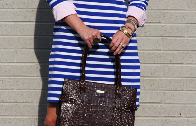 Dress: Gap (no longer available in XS – M); Oxford: Brooks Brothers; Bag: Kate Spade; Shoes: Old Navy; Sunglasses Target: Bracelets: Kate Spade; David Yurman; Alissa; Unknown: Watch: Baume & Mercier; Ring: NYC Street Fair find